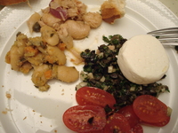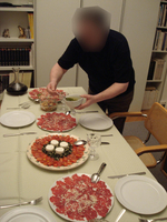 私がいたく気に入った前回の山羊チーズ、豆の煮込みに牛肉のカルパッチョ。ドイツ人って余り生肉を食べる習慣が無いと思うのですが、イタリアンをこよなく愛し、日本食に目覚めたパパ、こんな料理も作っちゃいます。(^^)